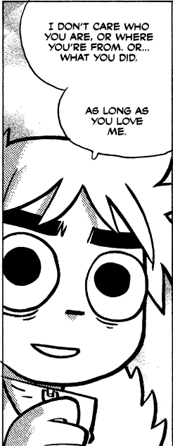 ive always liked scott pilgrim, it made me start drawing more seriously. i know scott is like an asshole cuz he cheated on knives but his relationship with ramona just feels so different. i wish i had something like that, id totally fight a bunch of exes if it meant i got to date a hot alt bi girl with colored hair